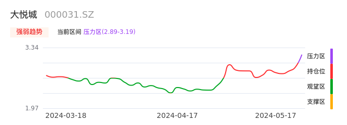我们来看一下该股的九方特色指标强弱趋势的情况:大悦城近日从持仓区进入压力区。股价出现一波快速拉升行情,目前上升动能较为充足可继续持股。注意今日上方压力位:3.19元是否能有效突破。
