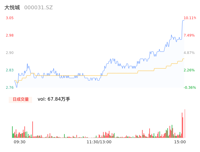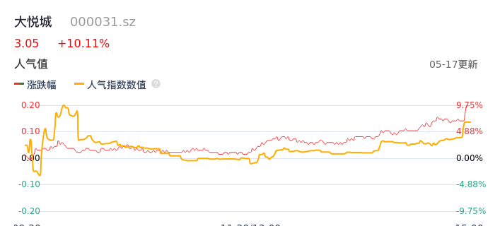 05月17日,大悦城收报3.05,股价涨幅10.11%,成交金额1.96亿元,换手率1.69%。