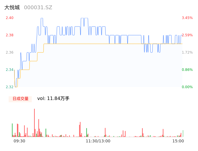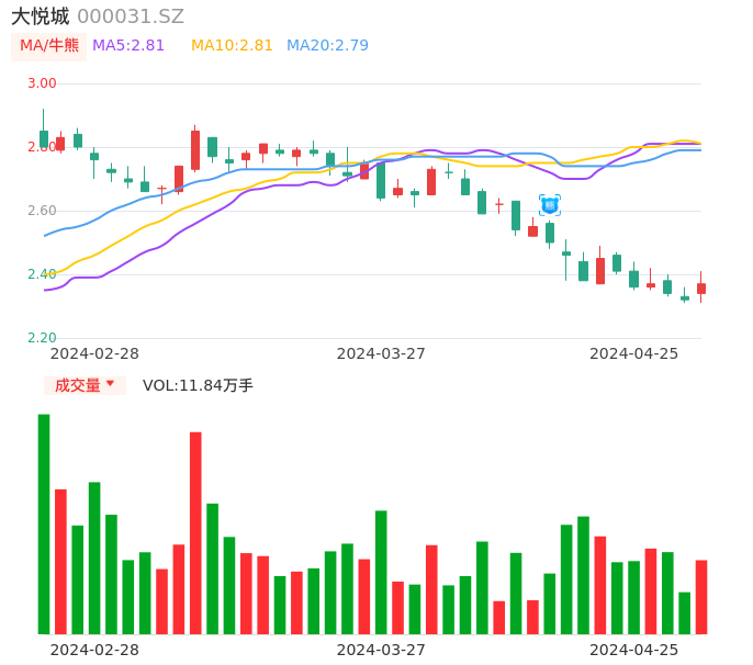 04月25日,大悦城收报2.37,股价涨幅2.16%,成交金额2809.02万元,换手率0.30%。