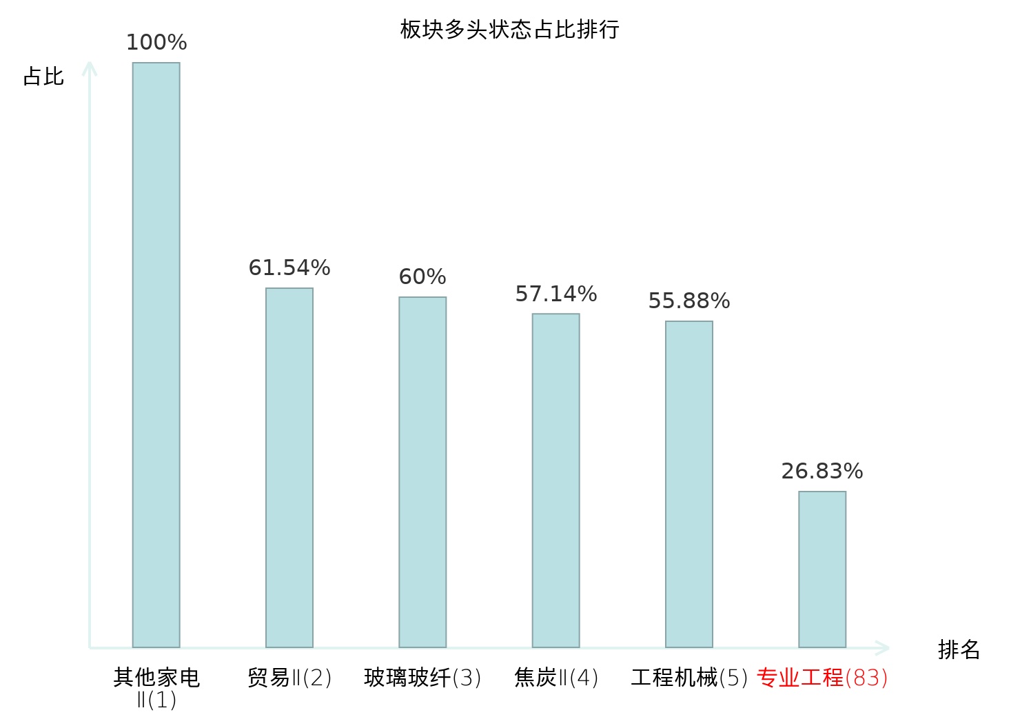 全市场所有行业板块中主力多头状态占比排名中,其他家电Ⅱ板块位居第一。航海装备Ⅱ板块名次提升最快,较昨日上升98位。