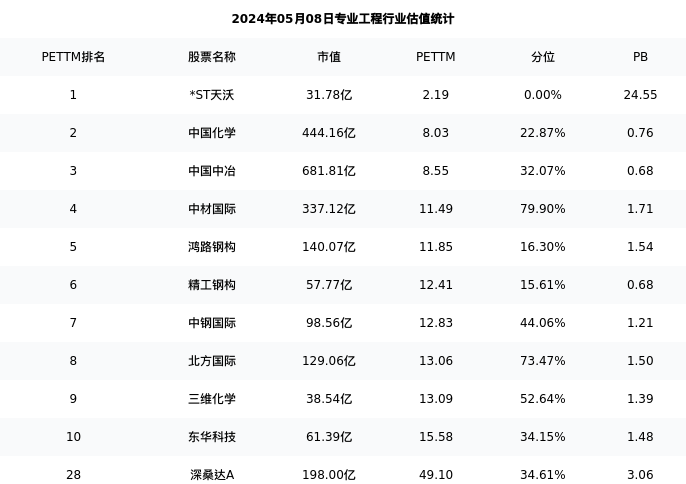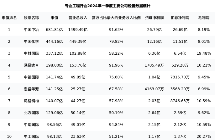 深桑达A最新报告期数据为一季度,下表汇总了专业工程行业内市值靠前的公司一季度主要经营数据