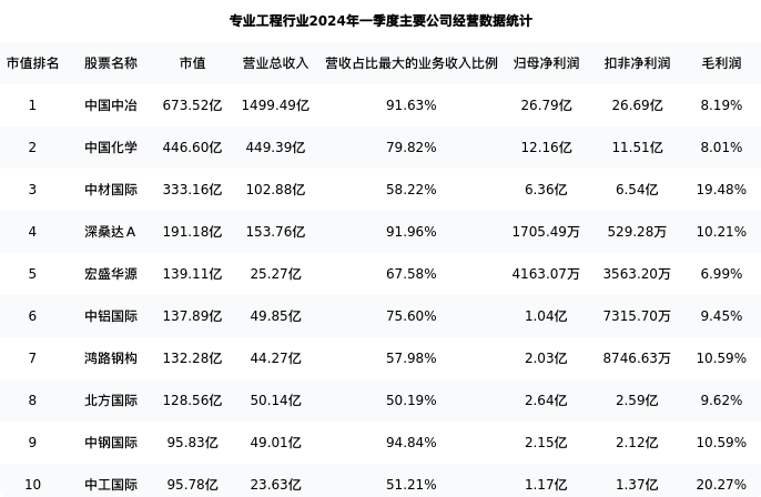 深桑达A最新报告期数据为一季度,下表汇总了专业工程行业内市值靠前的公司一季度主要经营数据