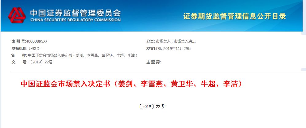 在此次证监会公布的市场禁入决定书中,共有5名相关负责人员被采取证券市场禁入措施,分别为深大通实际控制人姜剑、时任副董事长、董秘李雪燕、执行总经理、北京分公司负责人黄卫华、职工监事牛超和员工李洁。除姜剑被采取10年市场禁入外,其余4人均为5年。