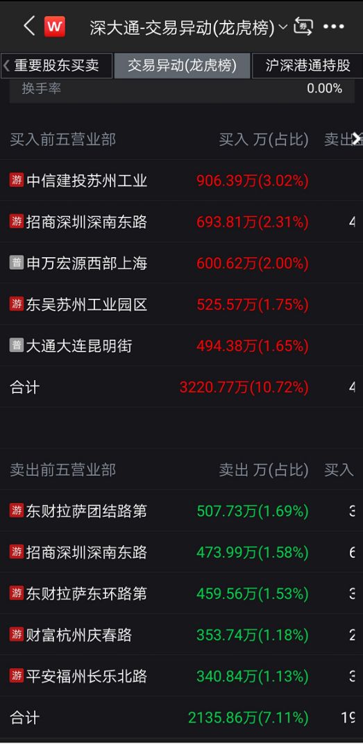 例如,在11月25日的龙虎榜上,就深大通交易前五的营业部来看,十家中有八家均为游资。其中,著名的东财拉萨团结湖第二营业部和东财拉萨东环路第二营业部均榜上有名。