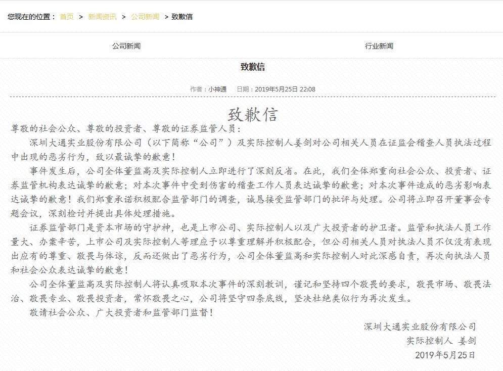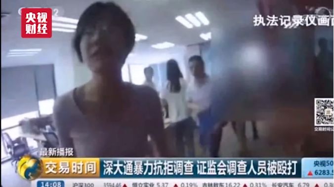 真正引发市场高度关注的还是在深圳的调查现场。2019年5月22日下午,证监会调查人员在深圳办公场所送达调查通知书过程中,深大通员工使用推搡、抓挠调查人员,抢夺、摔砸执法记录仪等暴力方法抗拒调查,致调查人员软组织损伤、手臂被抓伤、执法记录仪部分零件损毁。