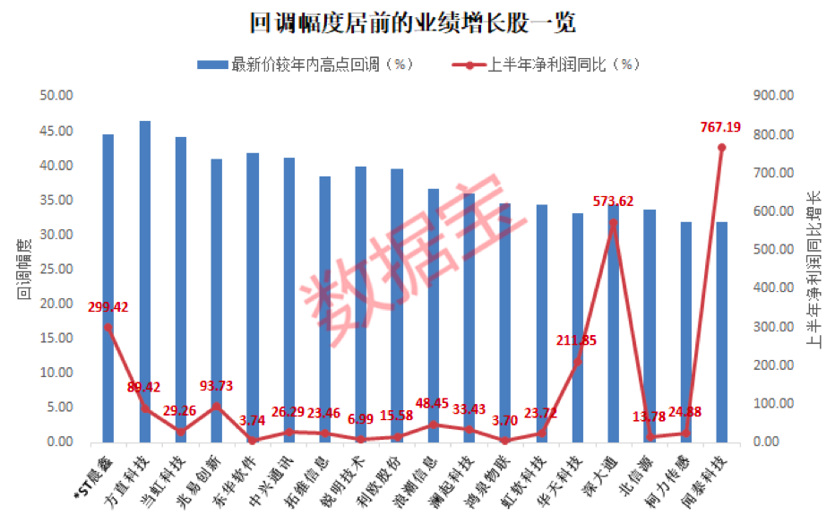 这152只股自8月以来经历了大幅回调,股价平均跌幅为3.78%。排除掉今年上市的次新股和依旧亏损的ST股后发现,有52股的最新收盘价较年内高点回调幅度超30%。将回调因素可能是业绩不佳的上市公司排除后,仍然有21只股业绩实现同比增长的同时回调幅度超30%。其中,闻泰科技上半年净利润同比增长767.19%,2017年底,闻泰科技与合肥高新区签署项目投资合作框架协议,在合肥高新区投资建设合肥闻泰人工智能研究院,主要进行人工智能终端产品的研发与设计。此外,神州泰岳深大通华天科技*ST晨鑫均实现业绩翻倍,股价回调充分。