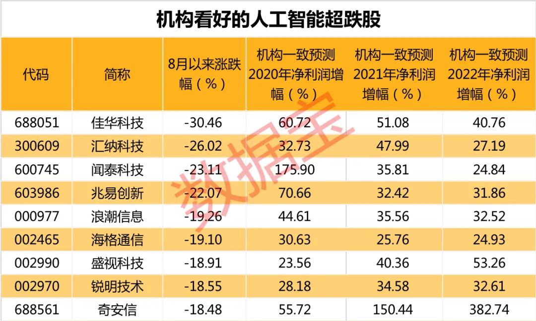 人工智能板块具有长期投资价值,备受机构青睐。从机构预测角度梳理这152只股可以发现,有9只超跌人工智能股被机构看好。这9只股兼具自8月以来跌幅超18%、机构一致预测目标价上涨空间超20%、2020年至2022年净利润增幅有望超20%的特点。