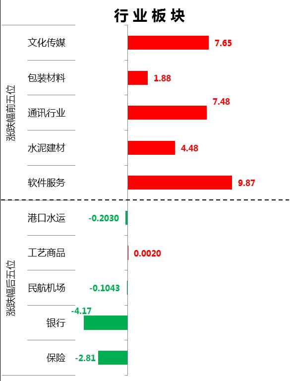 板块延续普涨行情,市场人气出现回升。行业板块日内全线收红(昨日57个),全天共有38个录得主力净流入(昨日仅14个),软件服务、通讯行业、文化传媒受到主力关注,大金融抛压凸显。