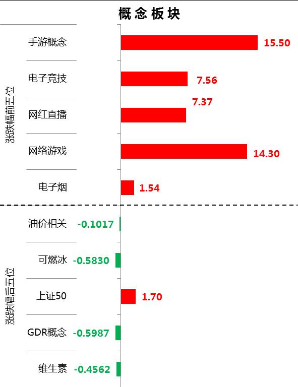 概念板块今日几乎也全部收涨(昨日220个),全天有151个录得主力净流入(昨日仅29个),手游概念、网络游戏备受青睐。