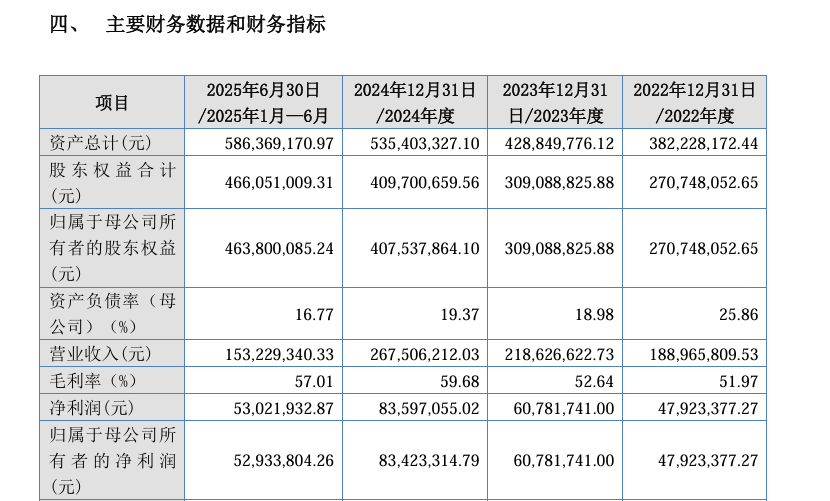财务方面,于2022 年、2023年、2024年和2025年1-6月,公司分别实现营业收入约为1.89亿元、2.19亿元、2.68亿元和1.53亿元,实现归属于母公司股东的净利润约为4792.34万元、6078.17万元、8342.33万元和5293.38万元。