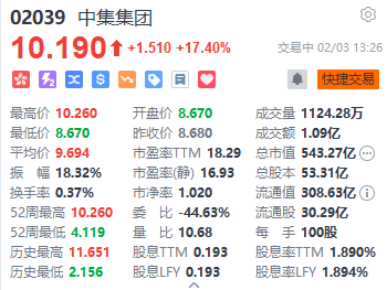 上证报中国证券网讯2月3日,中集集团H股早盘低开高走,开盘跌0.12%,随后震荡上行,一度涨超18%,最高报10.26港元/股。截至13时26分,中集集团H股涨17.40%,报10.19港元/股。同时,中集集团A股封住涨停,涨9.97%,报10.37元/股。