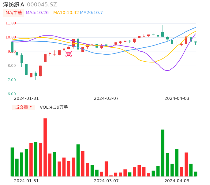 04月03日,深纺织A收报9.65,股价涨幅-0.62%,成交金额4203.01万元,换手率0.96%。