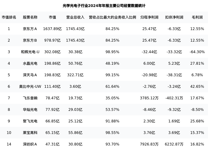 深纺织A最新报告期数据为年报,下表汇总了光学光电子行业内市值靠前的公司年报主要经营数据