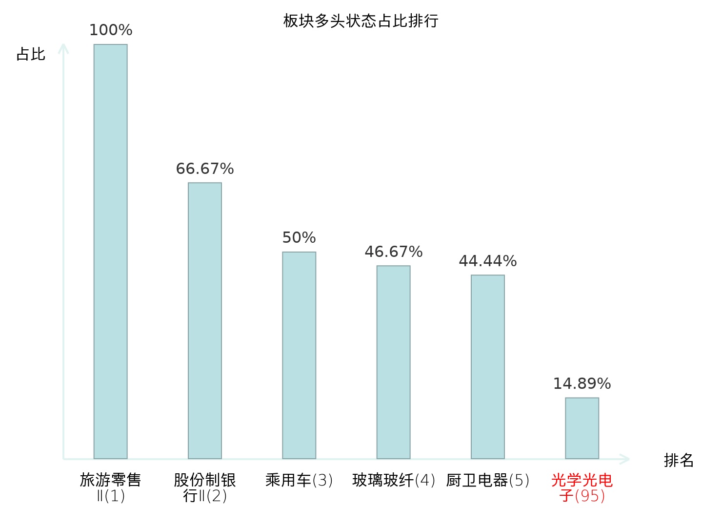 全市场所有行业板块中主力多头状态占比排名中,旅游零售Ⅱ板块位居第一。农产品加工板块名次提升最快,较昨日上升72位。