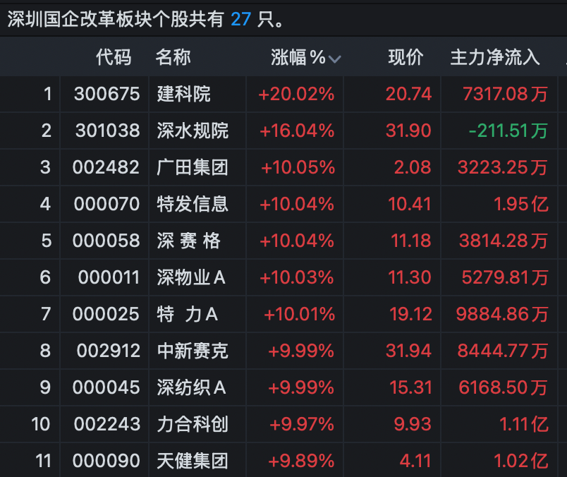 深圳国企改革板块高开。建科院20%涨停,广田集团、深赛格、深物业A、深纺织A、力合科创等多股涨停。