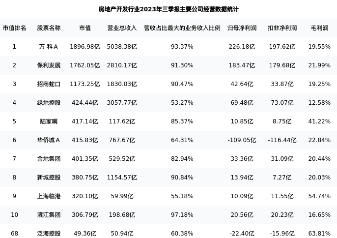 泛海控股最新报告期数据为三季报,下表汇总了房地产开发行业内市值靠前的公司三季报主要经营数据