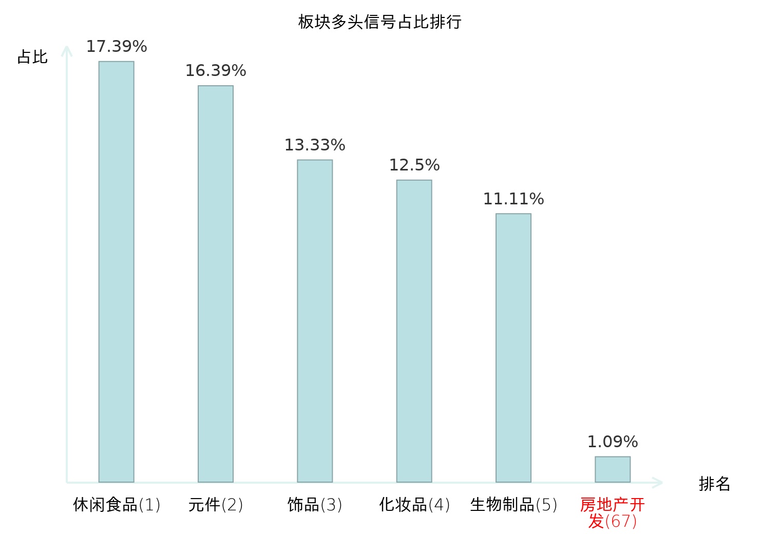 全市场所有行业板块中主力多头信号占比排名中,休闲食品板块位居第一。厨卫电器板块名次提升最快,较昨日上升108位。
