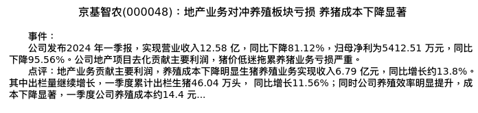 值得注意的是:2024年05月中邮证券的王琦分析师,首次发布关于京基智农的研究报告,标题为:京基智农(000048):地产业务对冲养殖板块亏损 养猪成本下降显著。