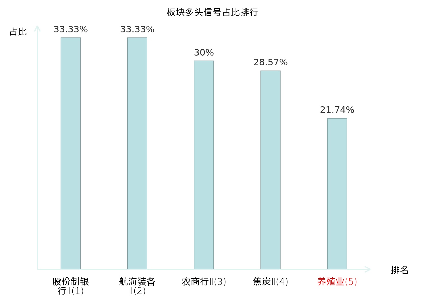全市场所有行业板块中主力多头信号占比排名中,股份制银行Ⅱ板块位居第一。焦炭Ⅱ板块名次提升最快,较昨日上升119位。