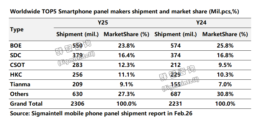 群智咨询数据显示,2025 年全球智能手机面板 Top5 厂商市场份额合计高达 72.7%,同比增长3.5个百分点,头部集中度进一步提升: