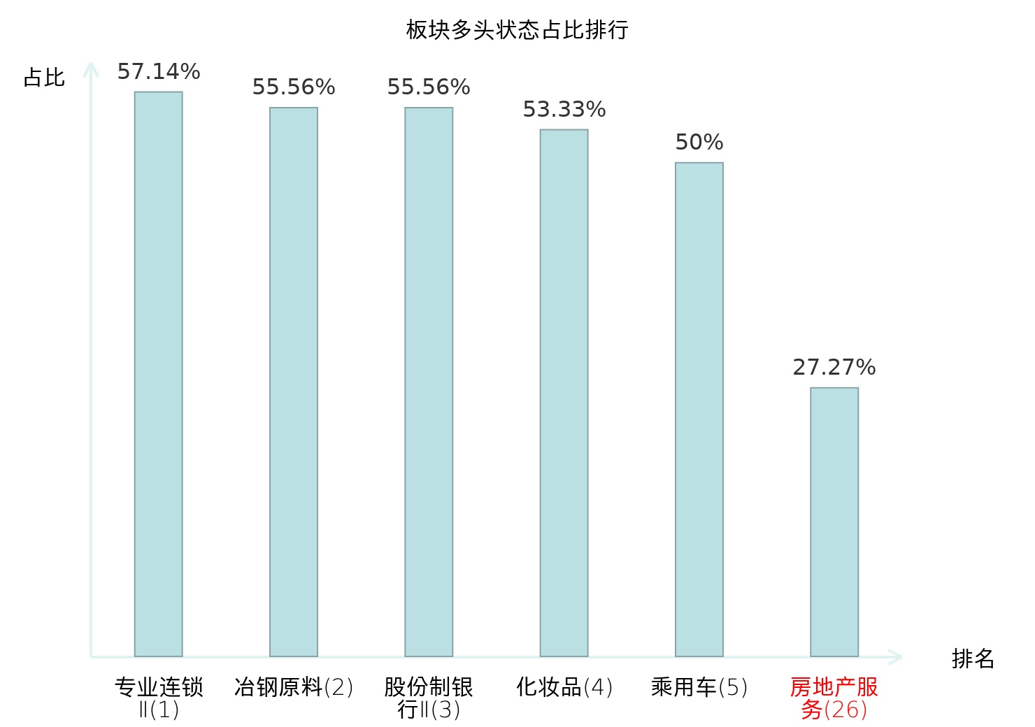 全市场所有行业板块中主力多头状态占比排名中,专业连锁Ⅱ板块位居第一。房地产服务板块名次提升最快,较昨日上升52位。