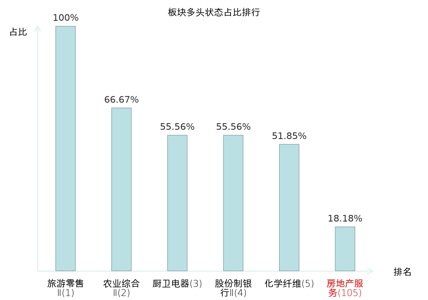 全市场所有行业板块中主力多头状态占比排名中,旅游零售Ⅱ板块位居第一。国有大型银行Ⅱ板块名次提升最快,较昨日上升103位。