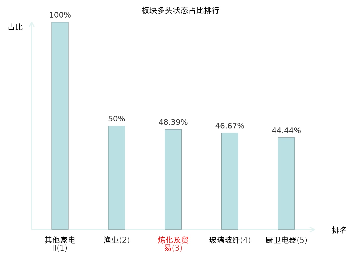 全市场所有行业板块中主力多头状态占比排名中,其他家电Ⅱ板块位居第一。冶钢原料板块名次提升最快,较昨日上升67位。