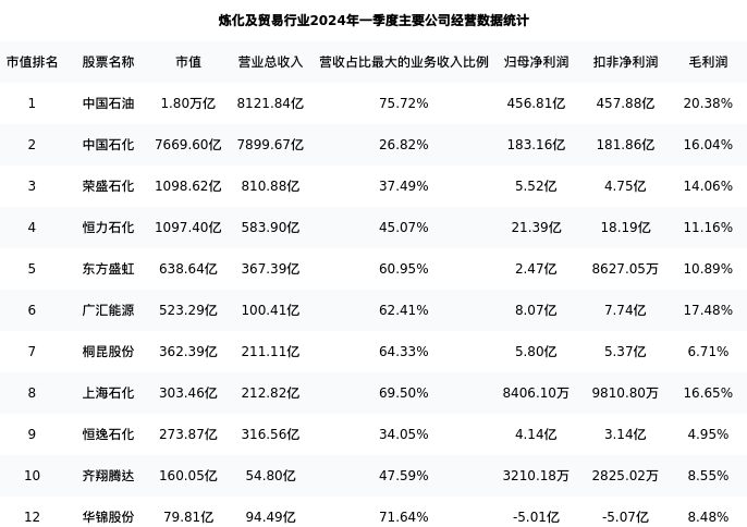 华锦股份最新报告期数据为一季度,下表汇总了炼化及贸易行业内市值靠前的公司一季度主要经营数据