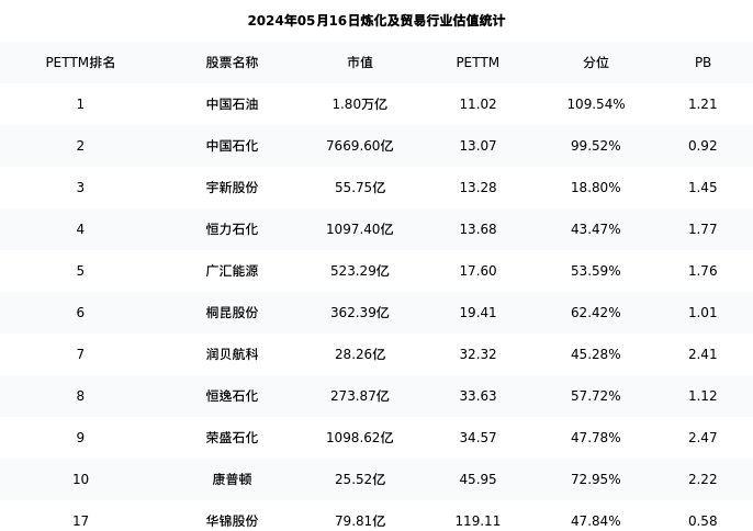 从估值角度看:华锦股份最新市盈率PETTM为119.11,在行业内排名17/29,处于47.84分位。