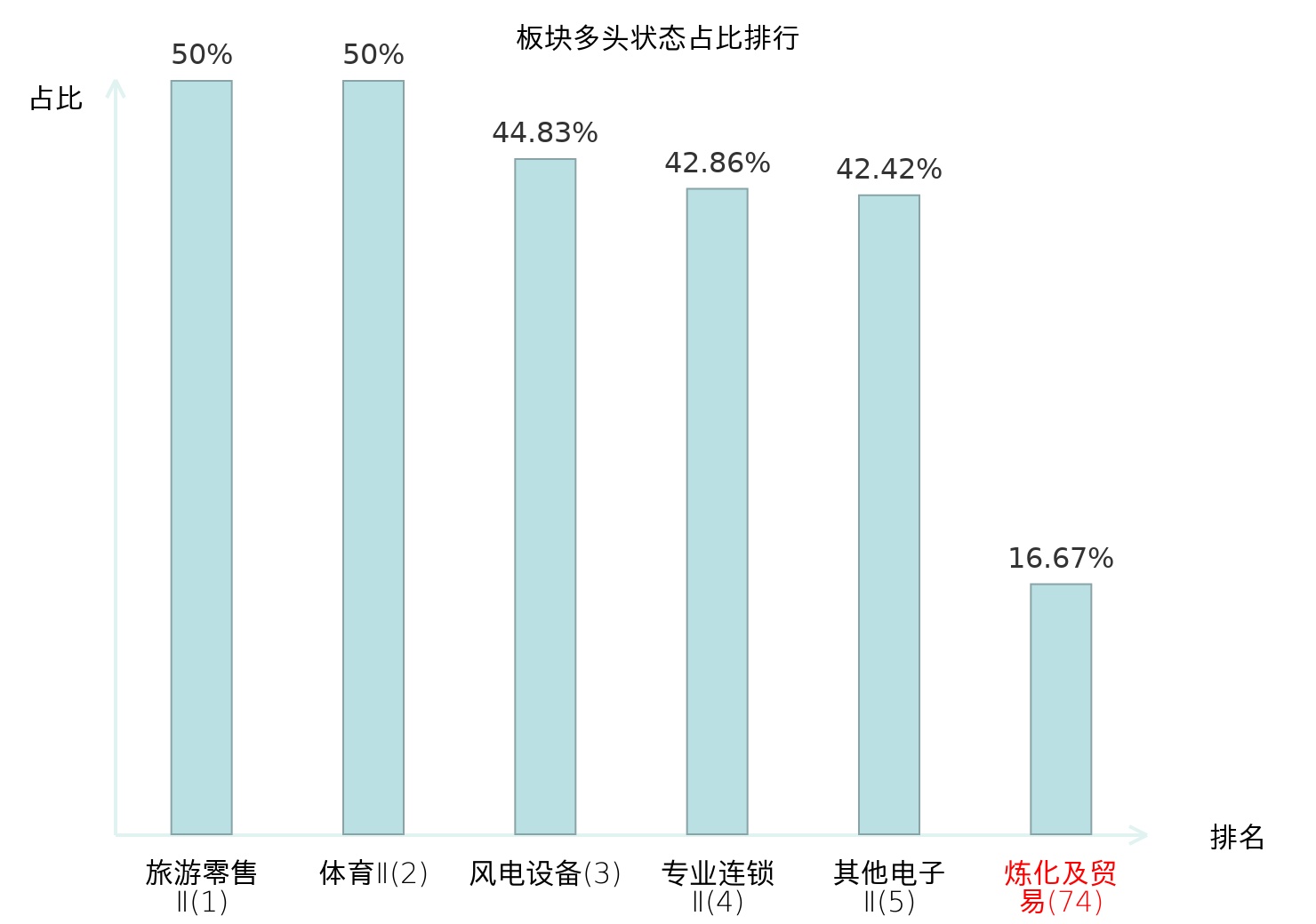全市场所有行业板块中主力多头状态占比排名中,旅游零售Ⅱ板块位居第一。化妆品板块名次提升最快,较昨日上升66位。