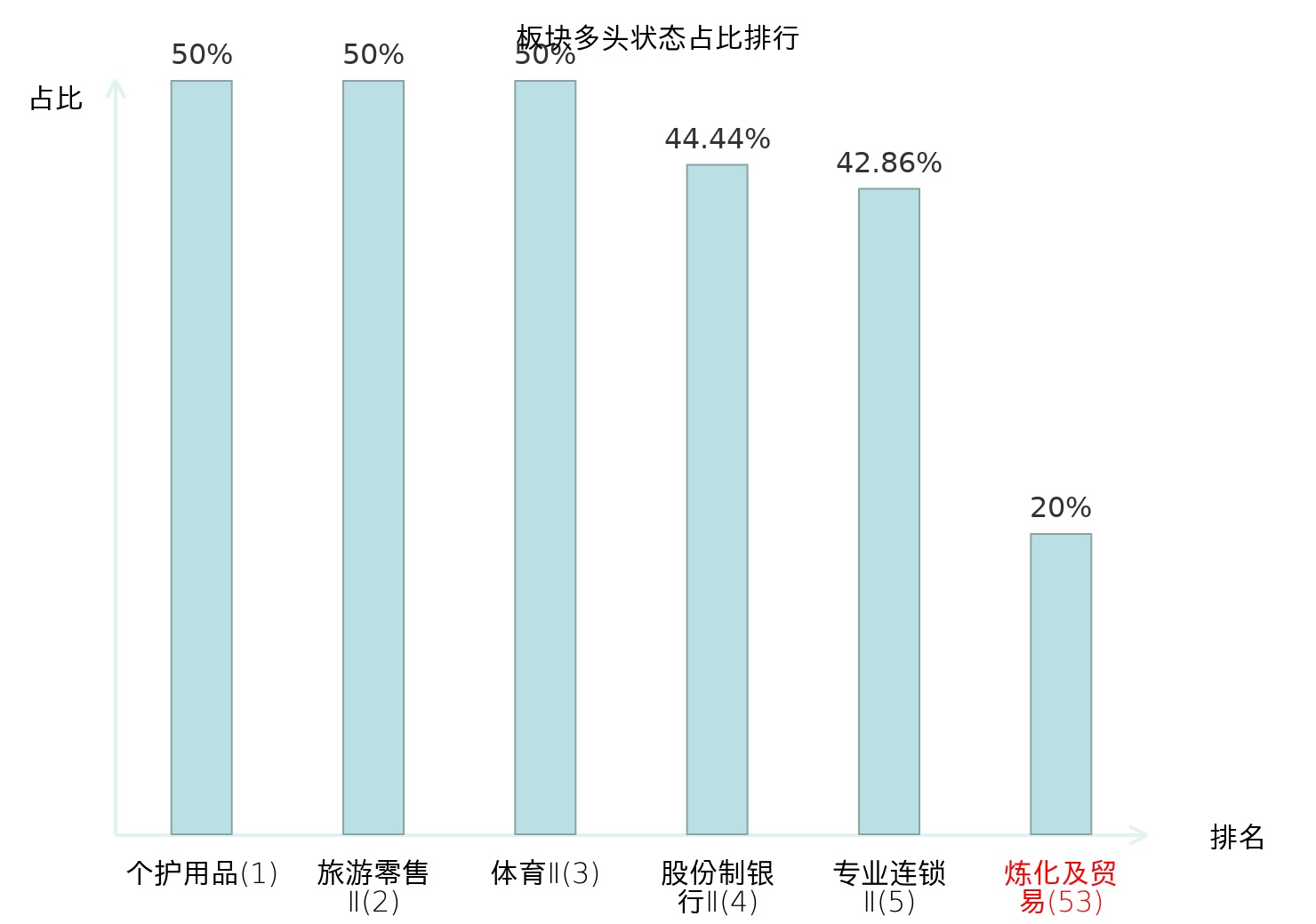 全市场所有行业板块中主力多头状态占比排名中,个护用品板块位居第一。非金属材料Ⅱ板块名次提升最快,较昨日上升37位。