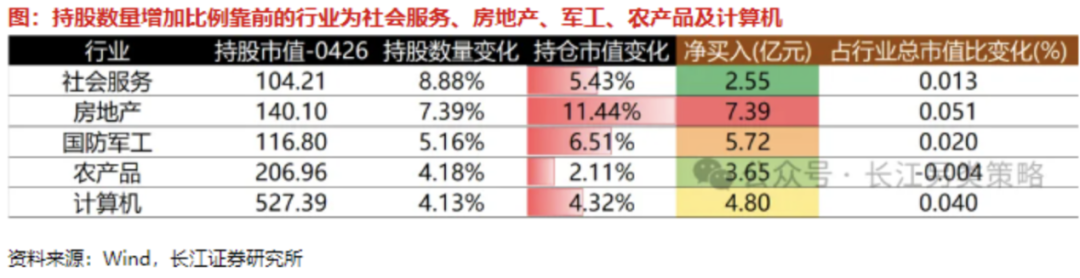 值得注意的是,A股北向资金4月26日净买入超220亿元,创历史最高,增持比例靠前的行业包括,房地产、军工、农产品及计算机等。长江证券指出,外资对于地产的增持侧面验证了当下外资对于中国地产反弹看多的态度。
