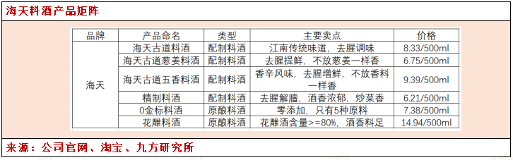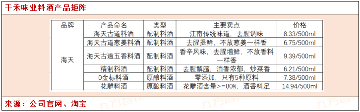 海天味业自2014年下半年推出了中端料酒产品,同时布局高端料酒市场。其在努力提高料酒产品质量的同时,还进行了产品品类细分,实现了料酒产品多元化,例如古道料酒、20度料酒、花雕料酒等。