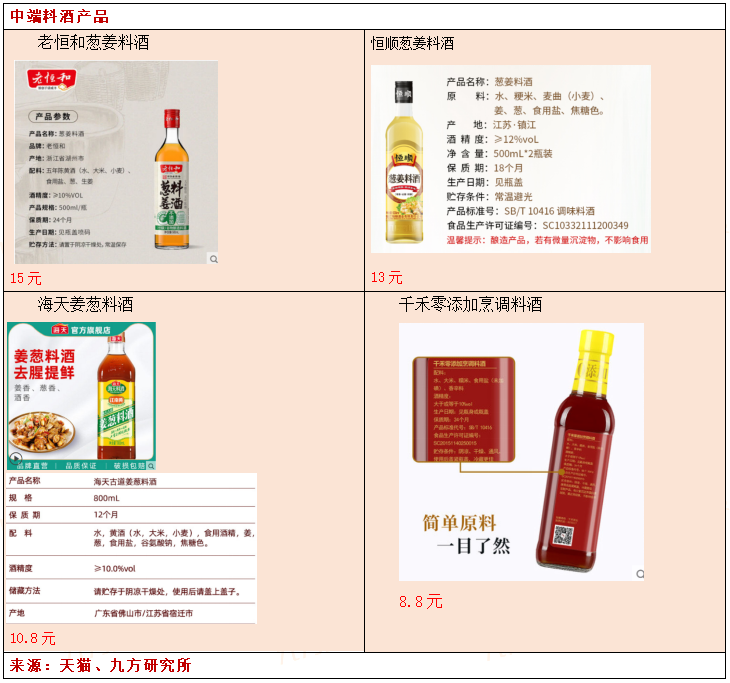 (2)中端:8-19元,配置料酒和原酿料酒都有,中端料酒主打功能性更多,如葱姜,五香等)。