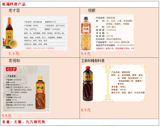 普通料酒:主打经济实惠,去腥增鲜,老才臣低端普通料酒线上销量占老才臣料酒的90%以上。