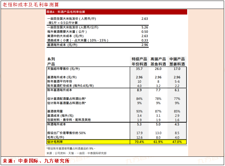 料酒主要原料为黄酒,而黄酒的主要原材料包括大米及小麦。大米是公司制作料酒的主要原材料,我们按照黄酒酿造方法估算公司料酒产品的毛利率。一般来说50斤大米能酿造100斤黄酒,因此每升基酒大约需要0.5公斤大米。我们的计算按以下假设: