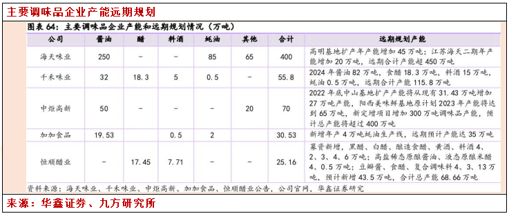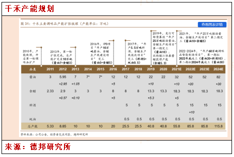 2016年开启料酒、蚝油产能建造项目,2017年投产补充5.5万吨产能(料酒5万吨+蚝油0.5万吨);预计2024年底公司调味品总产能达115.8万吨,其中包括酱油82万吨、食醋18.3万吨、料酒15万吨、蚝油0.5万吨。