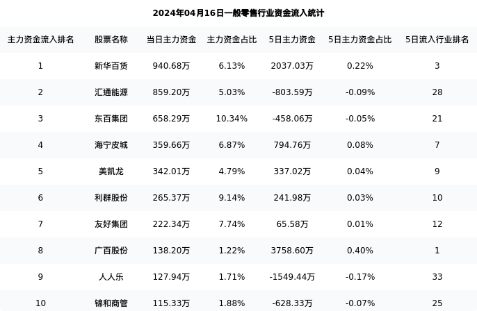 从主力资金流向来看,一般零售行业今日主力资金流入13.27亿元,在所有申万二级行业中排名:38/131。