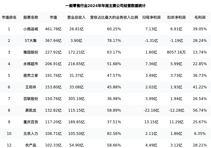 农产品最新报告期数据为年报,下表汇总了一般零售行业内市值靠前的公司年报主要经营数据