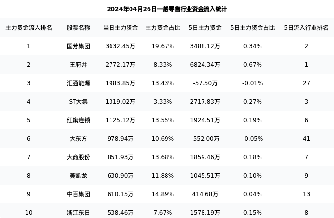 从主力资金流向来看,一般零售行业今日主力资金流入12.19亿元,在所有申万二级行业中排名:87/131。