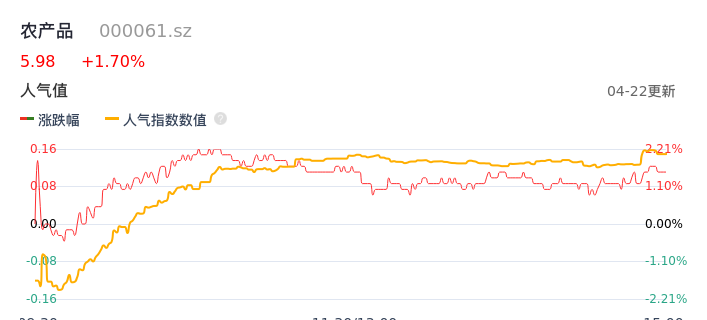 04月22日,农产品收报5.98,股价涨幅1.70%,成交金额7207.16万元,换手率0.71%。