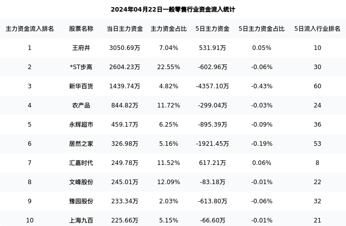 从主力资金流向来看,一般零售行业今日主力资金流入9.37亿元,在所有申万二级行业中排名:82/131。