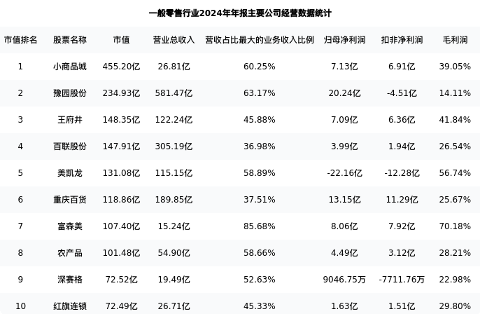农产品最新报告期数据为年报,下表汇总了一般零售行业内市值靠前的公司年报主要经营数据