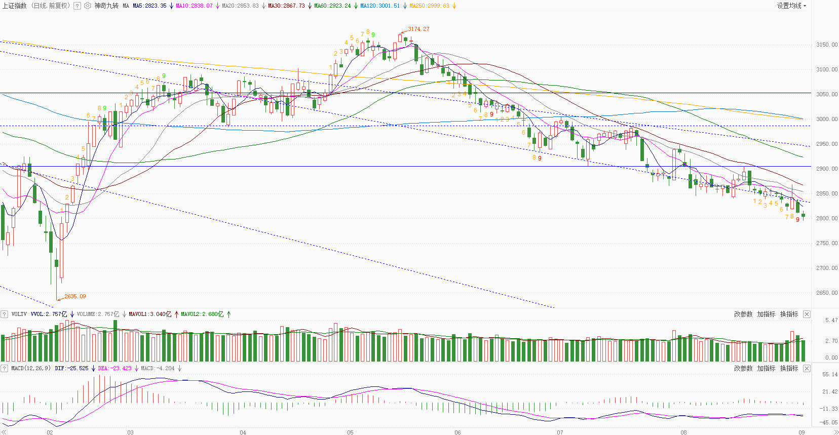 沪指来看,今日则依旧是下跌态势,2800点整数关口盘中告破,再创近期新低,这也在情理之中,毕竟,对比创业板和深成指来看,沪指跌幅是严重不足的,因为在护盘的过程中,神秘资金基本上都把力量投放在沪深300和上证50上,如果少了这部分力量,沪指应该也是接近2600的位置。