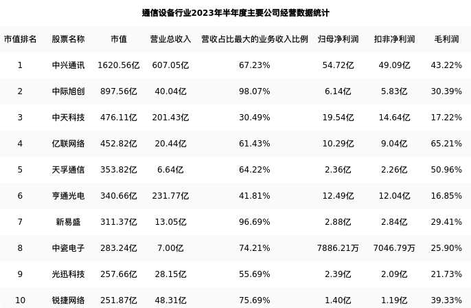 中兴通讯最新报告期数据为半年度,下表汇总了通信设备行业内市值靠前的公司半年度主要经营数据