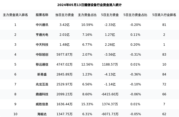 中兴通讯今日净流入3.42亿元,主力占比10.59%,在行业内排名:1/86;5日净流出2.33亿元,主力占比0.20%,在行业内排名:81/86。