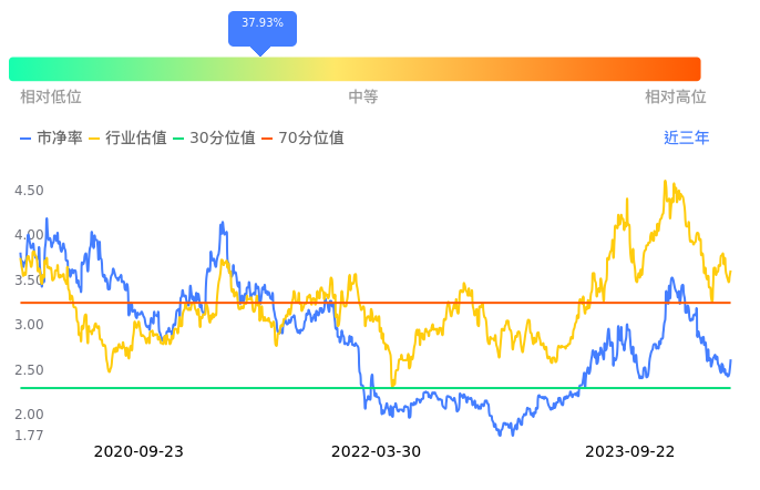 中兴通讯当前市净率PB为2.62,在所属的通信设备中,市净率PB排24,前五名分别为亨通光电市净率1.42、中天科技市净率1.51、辉煌科技市净率1.58、高鸿股份市净率1.63、长江通信市净率1.70。中兴通讯当前市净率PB为2.61,超过近3年37.93%的历史数据。