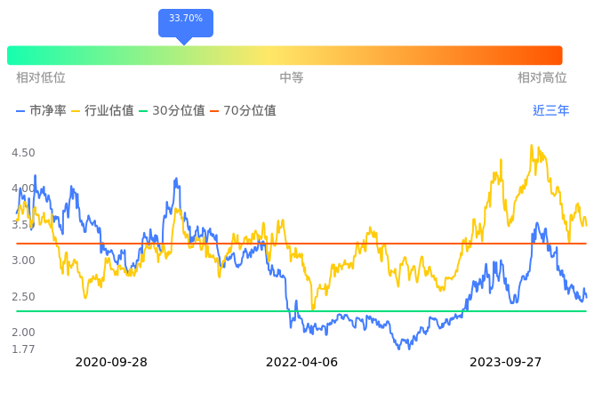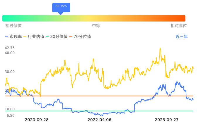 2023年09月27日,中兴通讯下跌2.66%收于32.98,今日成交金额27.87亿元。下文将从市盈率PETTM、市净率PB、市现率3个角度去分析公司估值情况。