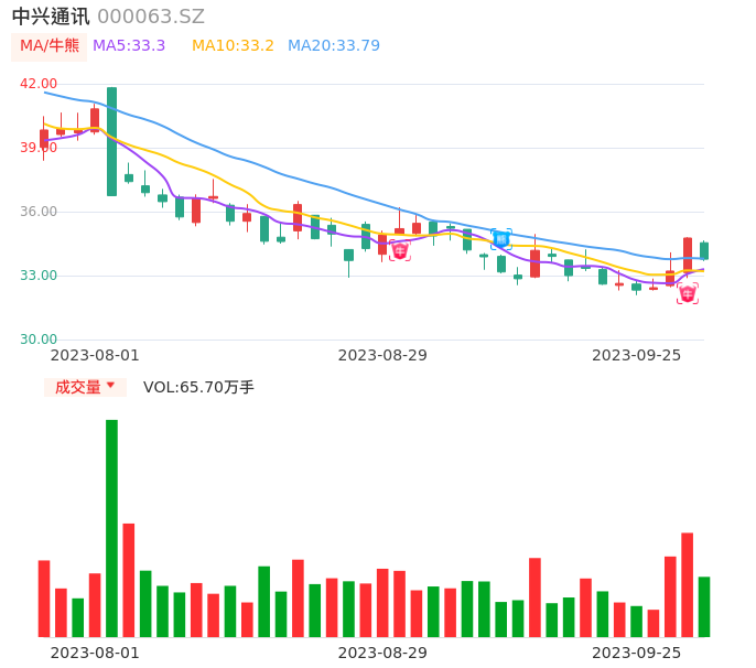 09月25日,中兴通讯收报33.77,股价涨幅-2.85%,成交金额22.38亿元,换手率1.63%。