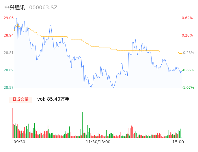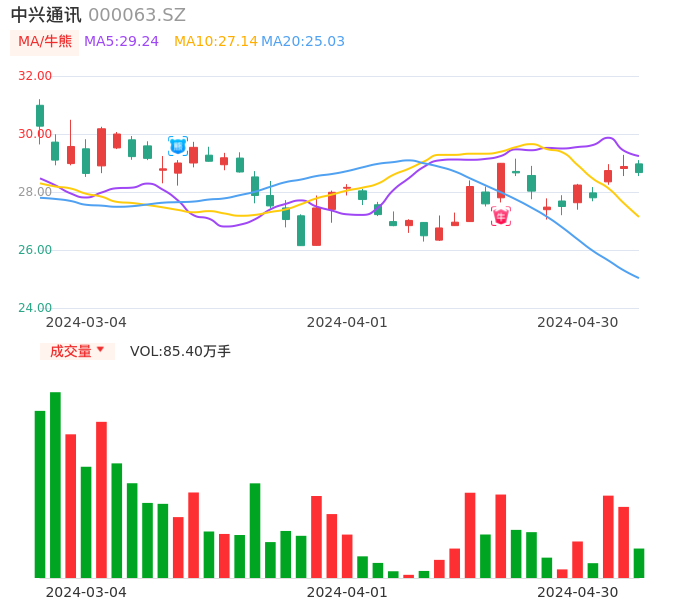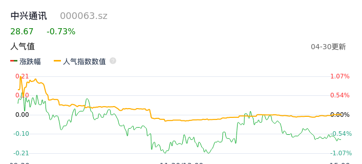 04月30日,中兴通讯收报28.67,股价涨幅-0.73%,成交金额24.60亿元,换手率2.12%。
